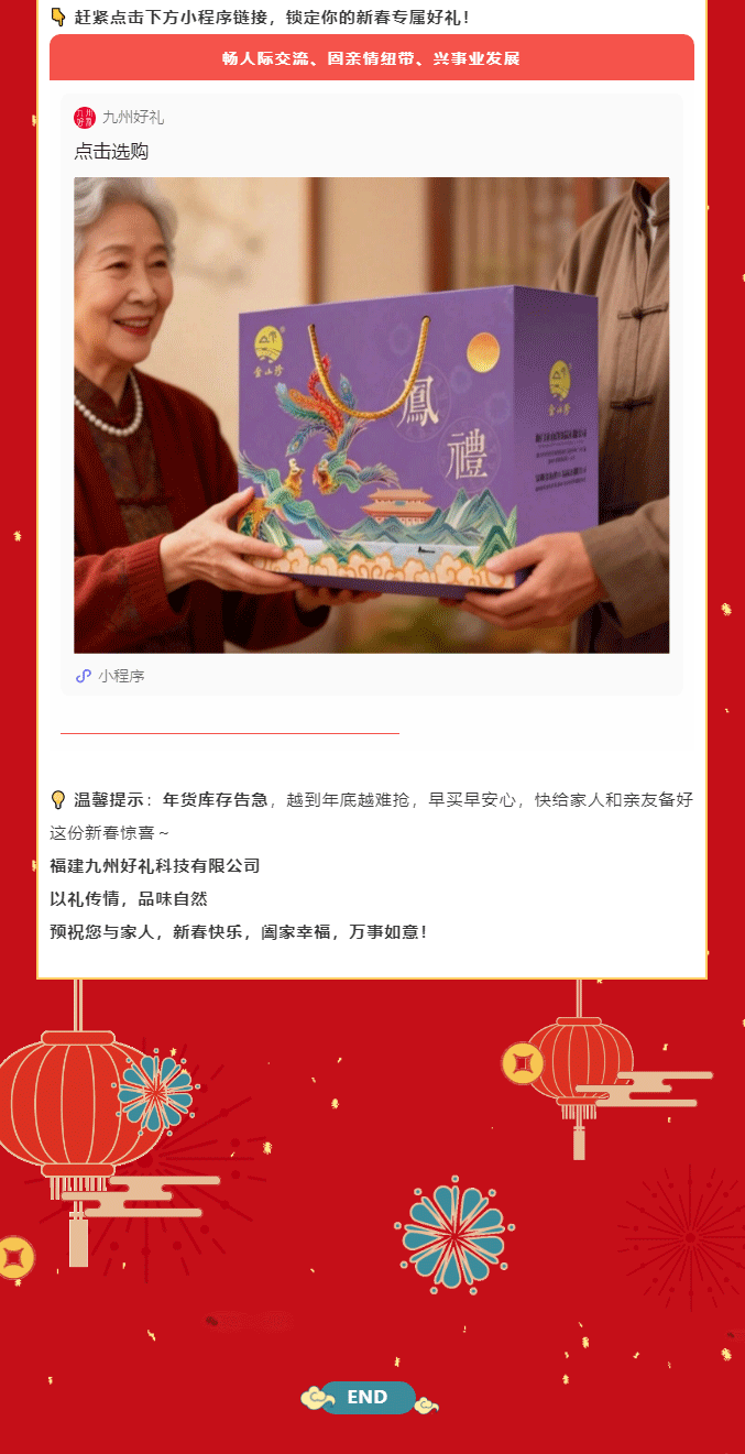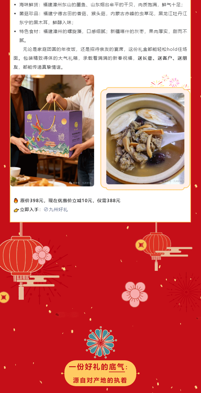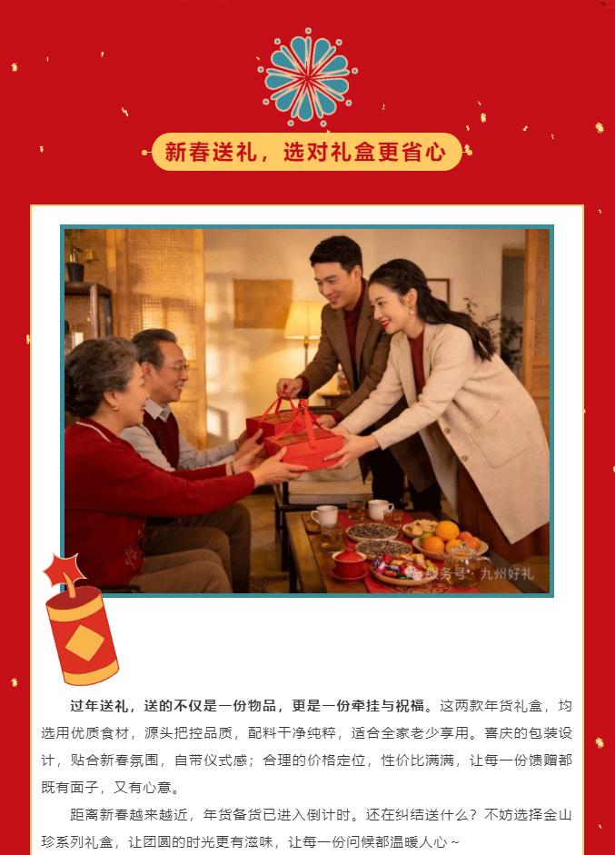 摘要:时光匆匆,年味渐浓。转眼已是二月,街头巷尾的红灯笼、家家户户的备年忙,都在诉说着对新春的期盼。过年,本就是团圆的相聚、心意的传递,而一份对味的年货礼盒,是最能体现这份温暖~