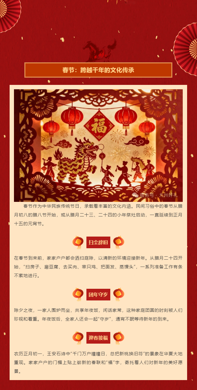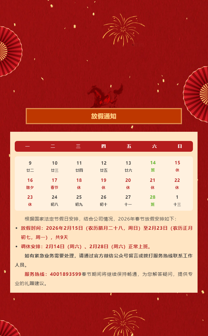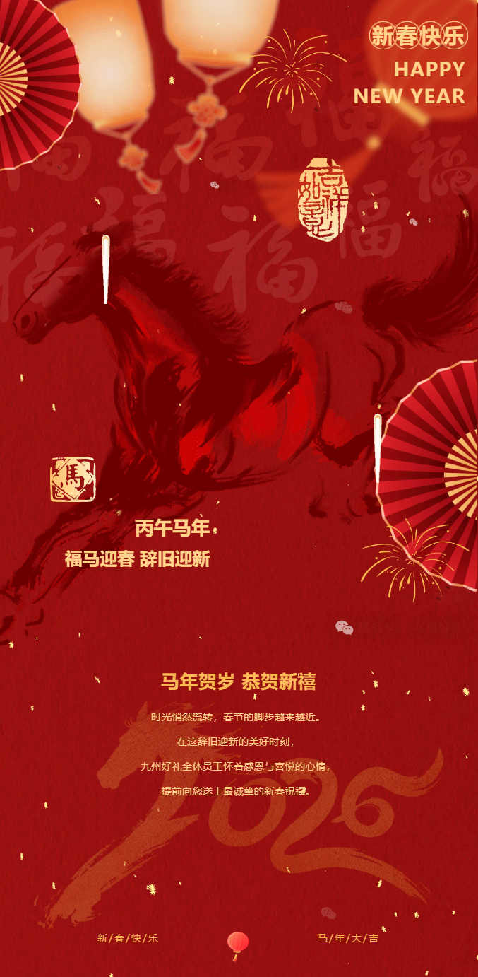 摘要:时光悄然流转,春节的脚步越来越近。在这辞旧迎新的美好时刻,九州好礼全体员工怀着感恩与喜悦的心情,提前向您送上最诚挚的新春祝福。