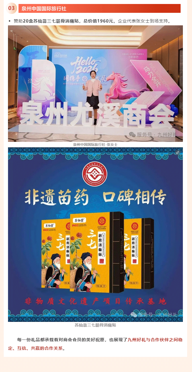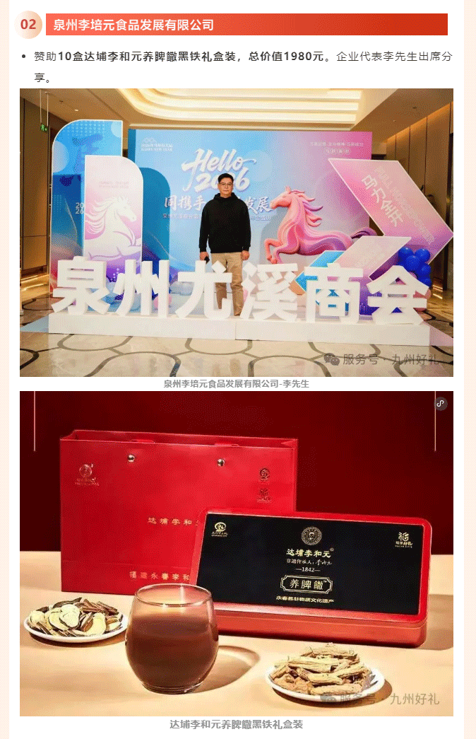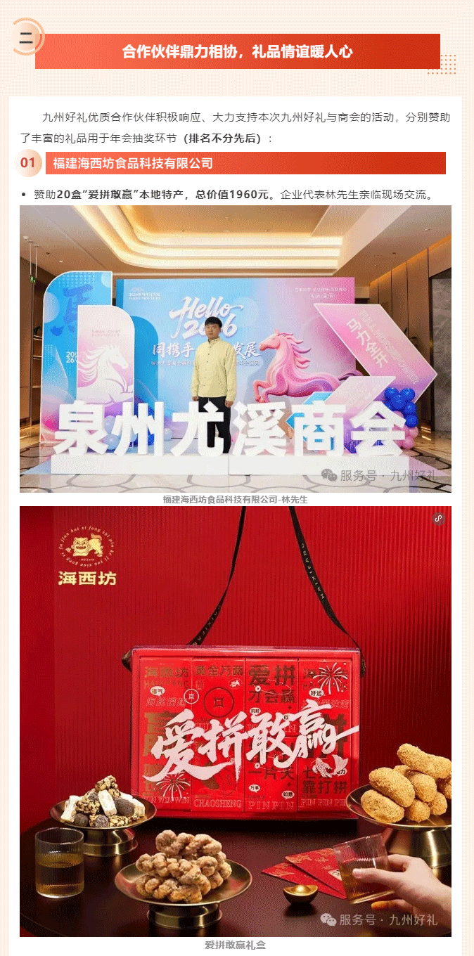 摘要:2026年1月2日,泉州尤溪商会第四届第二次会员大会暨年会盛典在泉州荣誉国际酒店隆重举行。本次盛会中,福建九州好礼科技有限公司旗下的中高端礼赠服务平台-九州好礼携手优质合作伙伴,共同为年会注入一份丰厚情谊。这不仅是一场乡情与商机交融的聚会,更是一次九州好礼携手优质伙伴链接本地商会、企业资源互联、携手共进的生态实践。