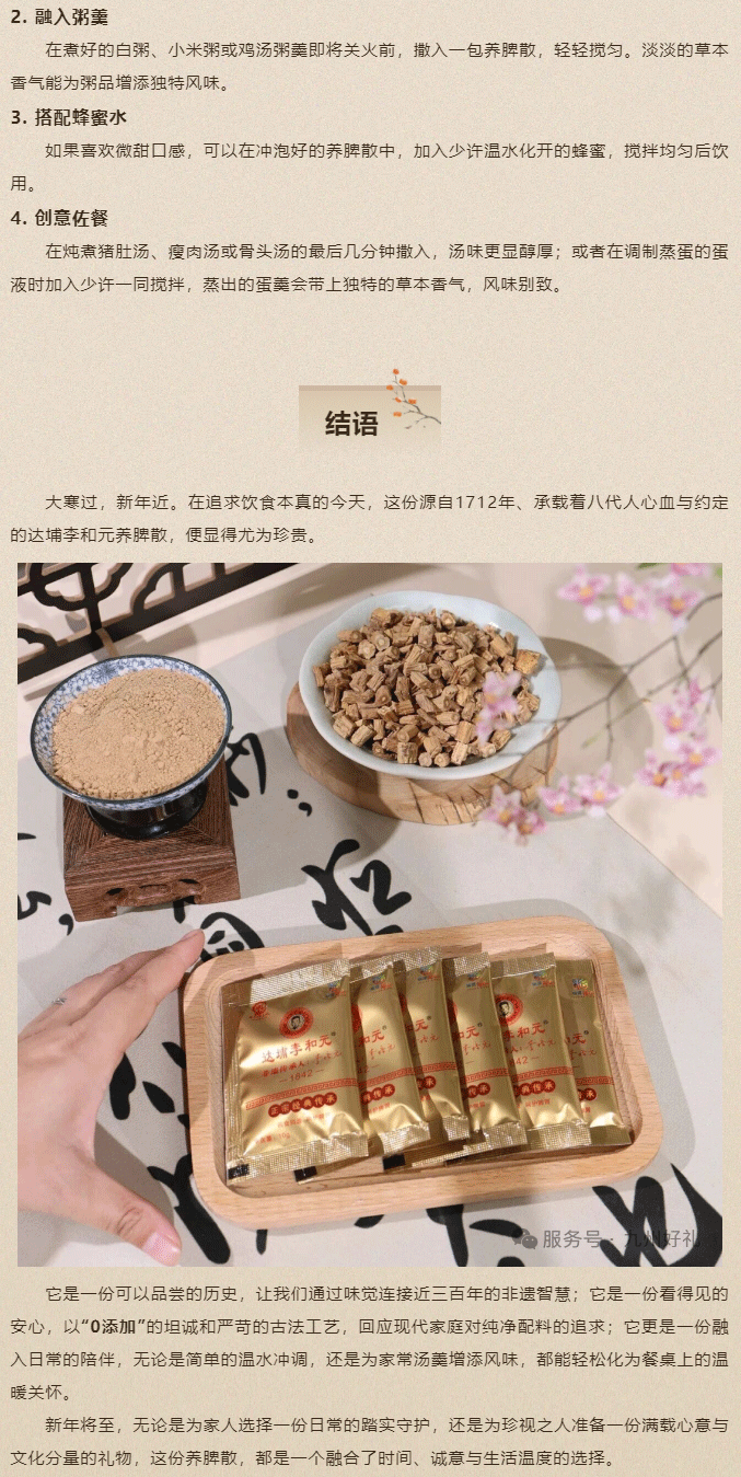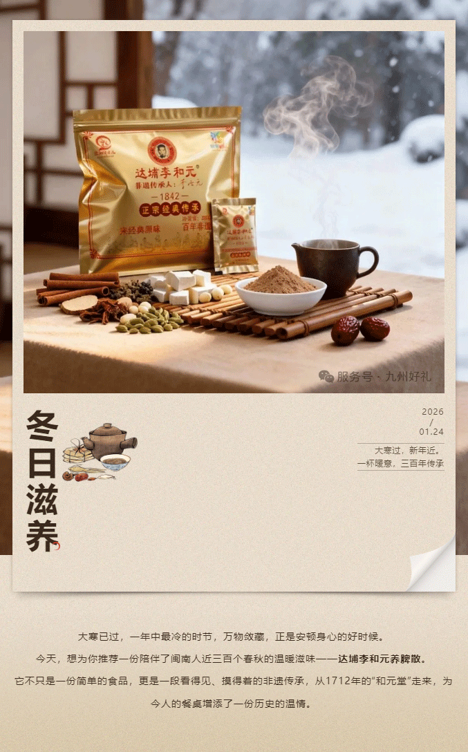 摘要:大寒已过,一年中最冷的时节,万物敛藏,正是安顿身心的好时候。今天,想为你推荐一份陪伴了闽南人近三百个春秋的温暖滋味——达埔李和元养脾散。它不只是一份简单的食品,更是一段看得见、摸得着的非遗传承,从1712年的“和元堂”走来,为今人的餐桌增添了一份历史的温情。